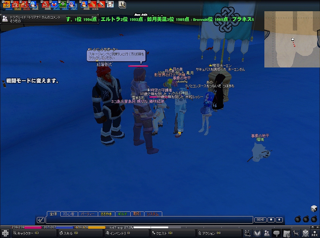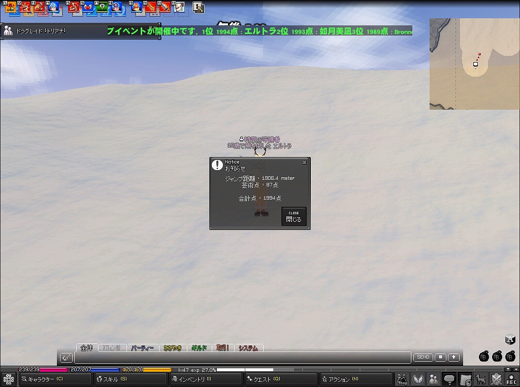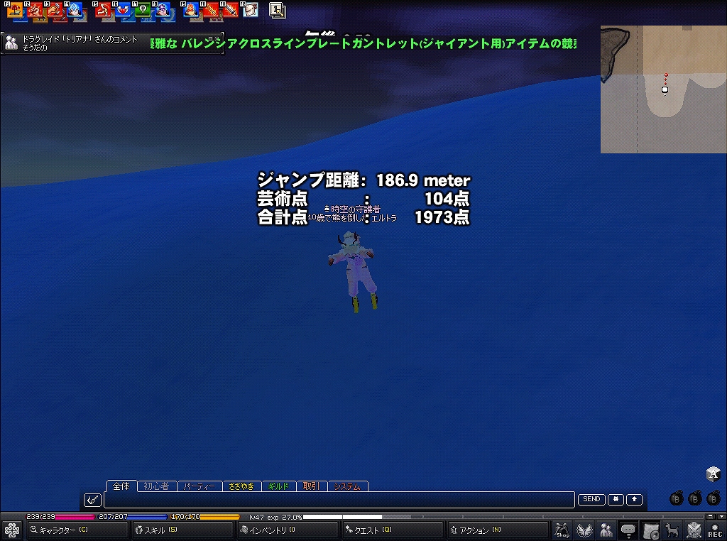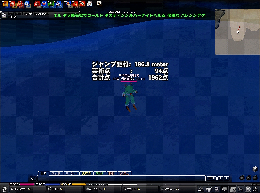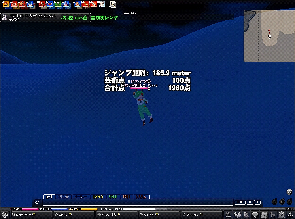 今年はスキージャンプみたいです スキージャンプといえばむかーしにスキー場を見に長野県まで行ったなぁ~ いやぁ~、上から見た光景は・・・チビるかと思った(゚д゚) 下から見るとそこまでないなーって思うんですが ところがどっこい、上から見ると、とんでもなく角度が半端ないんですよw 吸い込まれそうなくらい角度がすごいんですw びっくりしましたね~ では話はマビにw 早速、ピシスに行って、スキー場に到着! さぁスキージャンプ始めるぞー ブーンw ・・・・・・・・・ ・・・・・・ ・・・ ふぅ、結構慣れてきたぜ~ どんどん行くぞー ぬお、なかなかのいい点数 問題は飛距離か・・・よし、つぎぃ! むお、あがったw 次は技術点100点以上を目指すぞ! なんと!技術点100点以上だ(・∀・) よおし、まだまだがんばるw そしてこの時が・・・ き、キタ─wwヘ√レvv~(゚∀゚)─wwヘ√レvv~─ !!! 脅威の1994点!! 俺大歓喜(*゚∀゚)=3 そしてテロップに! やったお(*゚∀゚) 感激物だお(*゚∀゚) てなことがあってテンション↑↑状態w てことでここらでさいなら~ww PR